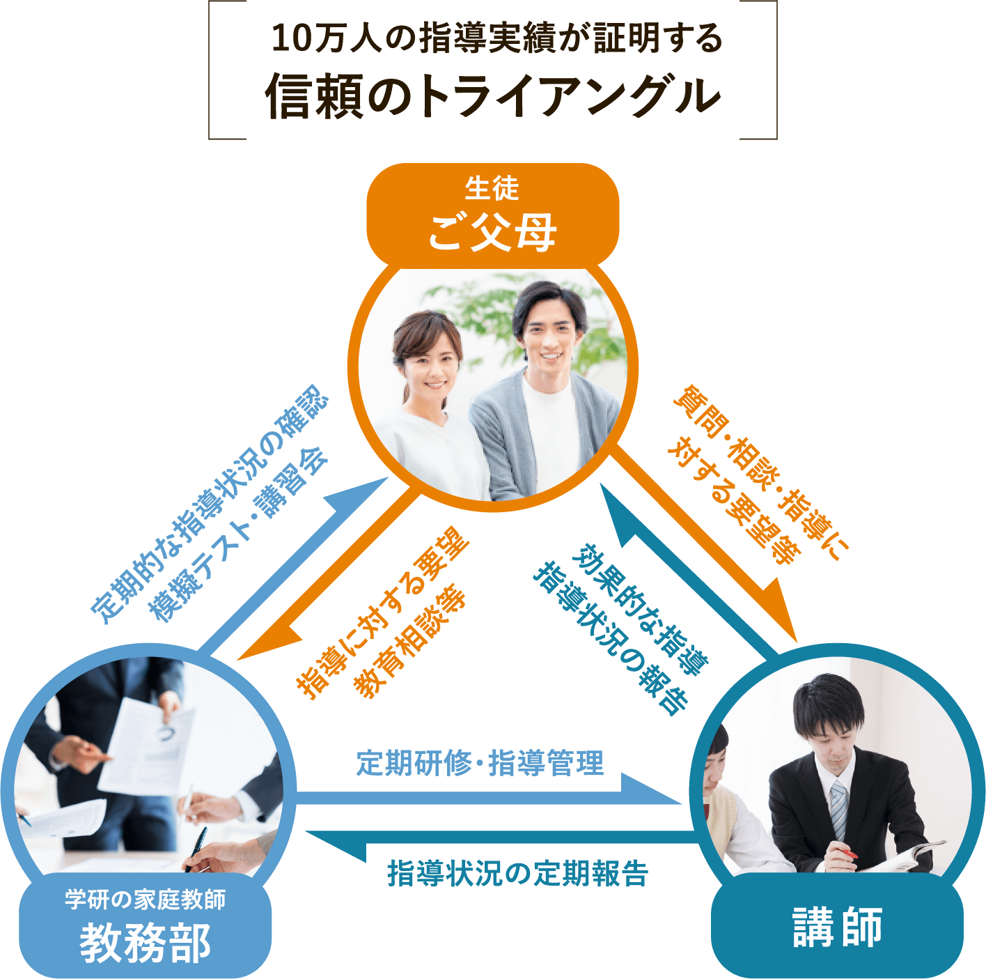 学研の家庭教師は、教務部に対して毎月の報告を義務付けております。「指導報告書」「定期ミーティング」「個別ミーティング」のシステムにより、お子様の指導状況をチェックし、目標達成までの学習管理を教務部のバックアップにより綿密に行いますので自主学習の習慣と共に学力が向上していきます。