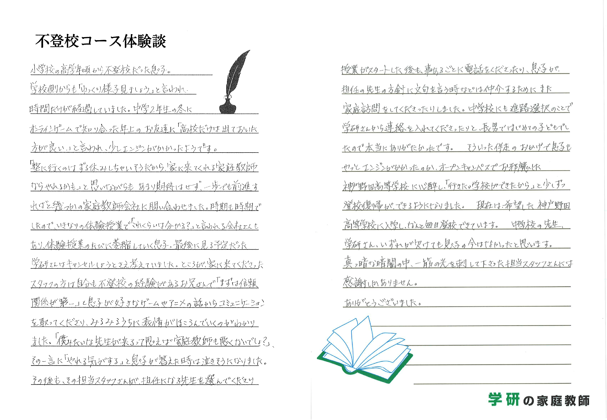 現在は希望した神戸野田高等学校に入学し、なんと毎日登校できています。中学校の先生、学研さん、いずれが欠けても息子の今はなかったと思います。