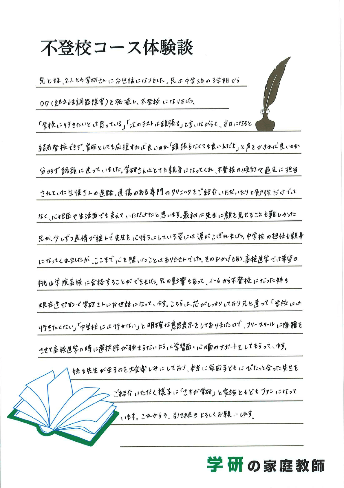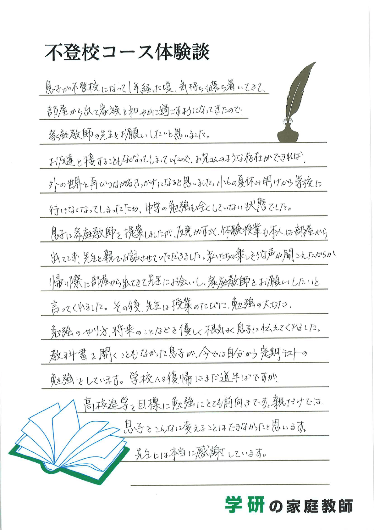 中学進学後、このままではいけないと藁をもすがる思いで「不登校専門対応」を謳っておられた学研の家庭教師に問い合わせをしました。