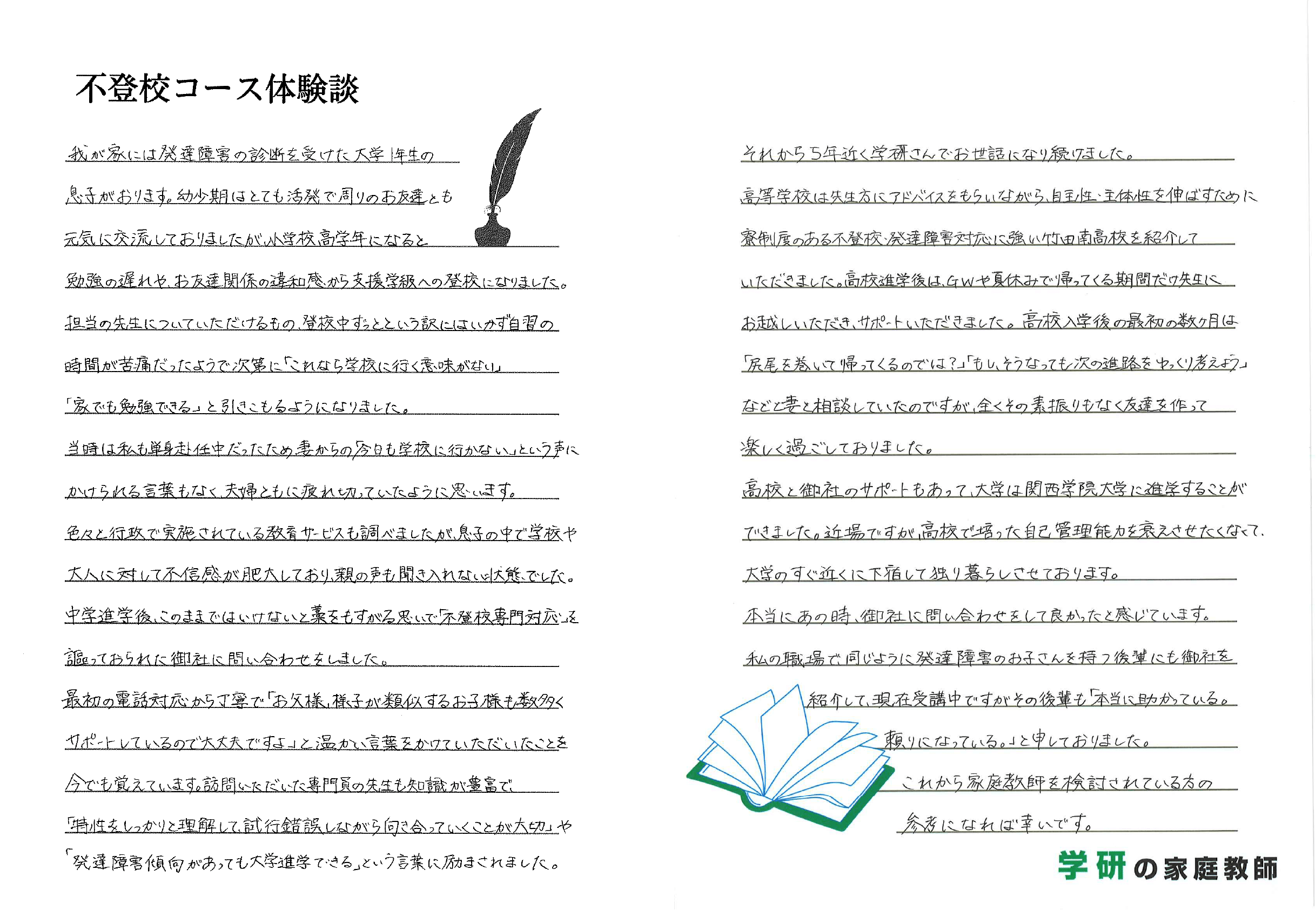 訪問いただいた専門員の先生も知識が豊富で、「特性をしっかりと理解して、試行錯誤しながら向き合っていくことが大切」や「発達障害傾向があっても大学進学できる」という言葉に励まされました。それから5年近く学研さんでお世話になり続けました。