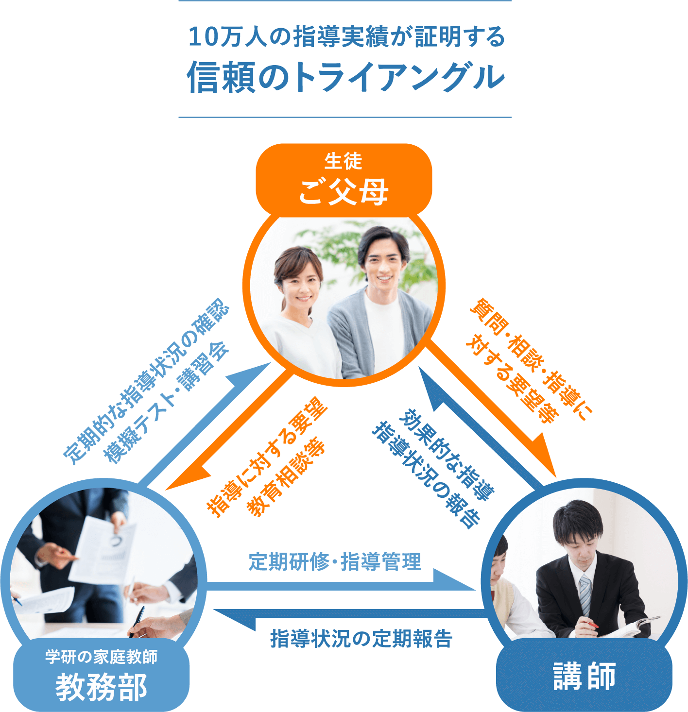学研の家庭教師は、教務部に対して毎月の報告を義務付けております。「指導報告書」「定期ミーティング」「個別ミーティング」のシステムにより、お子様の指導状況をチェックし、目標達成までの学習管理を教務部のバックアップにより綿密に行いますので自主学習の習慣と共に学力が向上していきます。