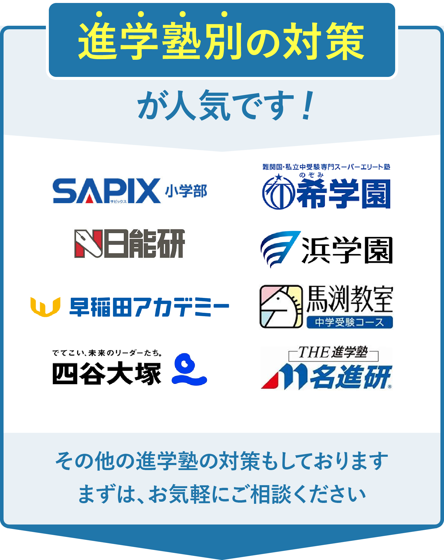 これまで約40年の実績を基に、大手進学塾のカリキュラムを把握し、お子様に最適な学習をご提案しております。